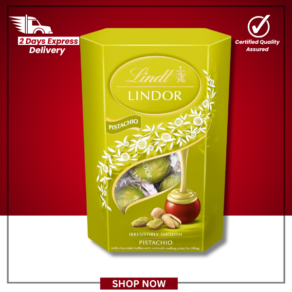 Delight in a luxurious British-style chocolate experience with Lindt Lindor Pistachio Truffles—creamy milk chocolate enveloping a smooth pistachio-infused centre.