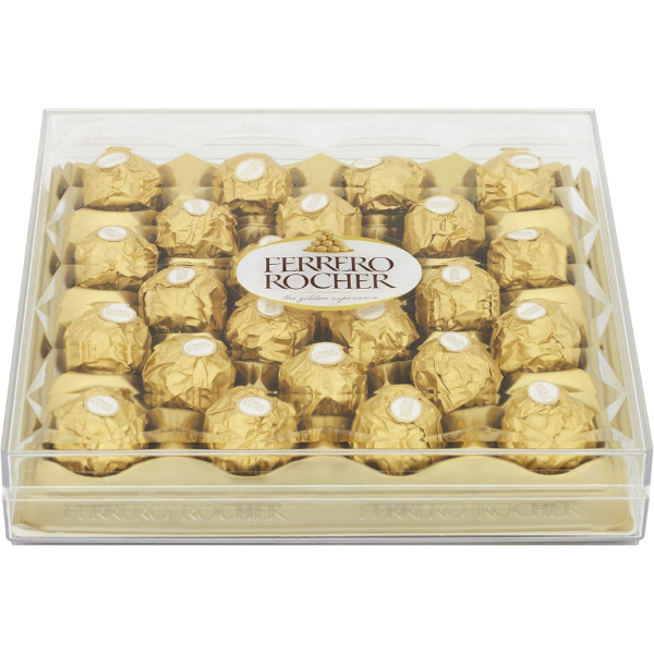 Delight in the ultimate British-style chocolate experience with Ferrero Rocher, where creamy milk chocolate, crunchy hazelnuts, and a crisp wafer create a truly luxurious treat.