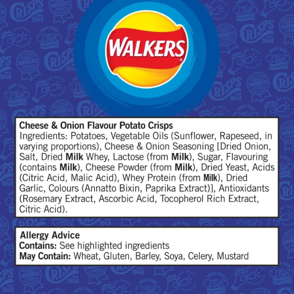 Experience a quintessentially British snack with Walkers Cheese & Onion Crisps — perfectly crunchy, full of bold flavour, and made with 100% Great British potatoes.