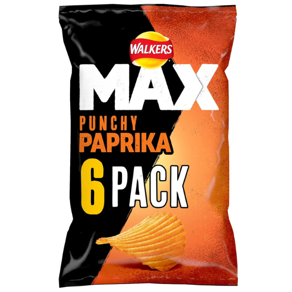 Experience a bold British snacking favourite with Walkers Max Punchy Paprika — deeply ridged crisps packed with rich, smoky paprika flavour.