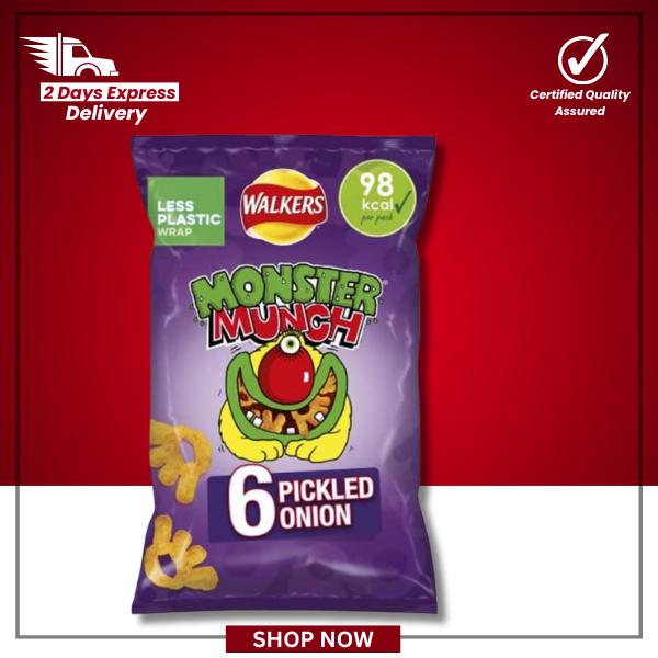 Enjoy a tangy British classic with Walkers Monster Munch Pickled Onion — crunchy, playful corn snacks loved by generations.