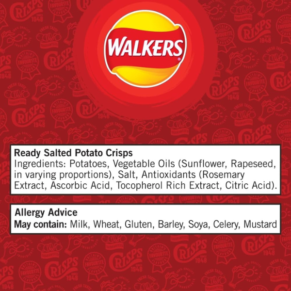 Nothing says classic British snacking quite like Walkers Ready Salted Crisps — perfectly sliced potatoes seasoned simply for a clean, timeless crunch.