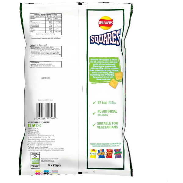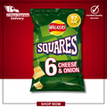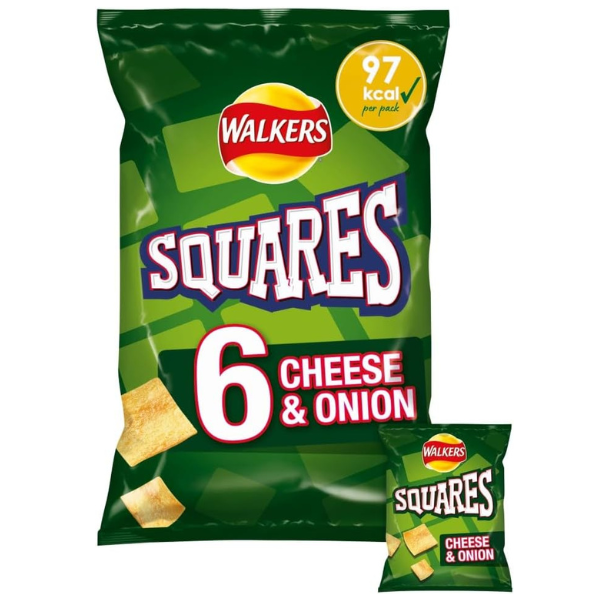 Discover the quintessential British snack with Walkers Squares Cheese & Onion Crisps — perfectly crisp, uniquely square-shaped, and full of classic flavour.